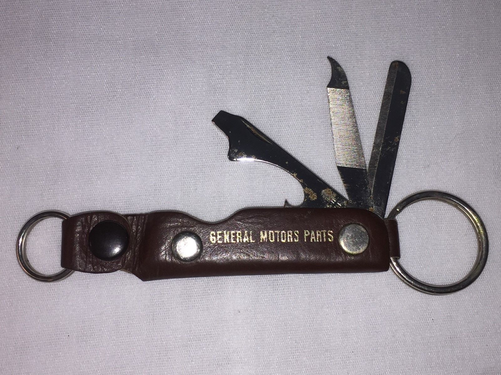 Title (ebay affiliate link): Vintage General Motors GM Leather Keychain Folding Pocket Knife Bassett USA Rare