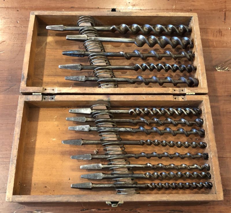 Title (ebay affiliate link): Antique Auger Brace Drill Bits In Wooden Box Greenlee, James Swan, Miller Falls