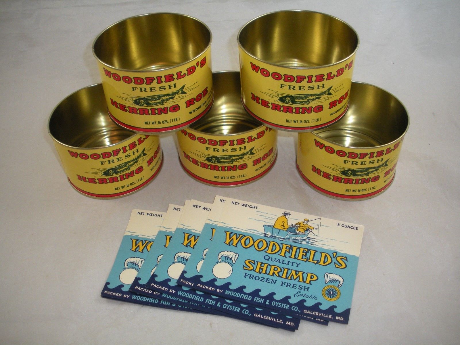 Title (ebay affiliate link): Woodfield Fish & Oyster Herring Roe Tin Can 5 & Shrimp Labels Galesville MD NOS