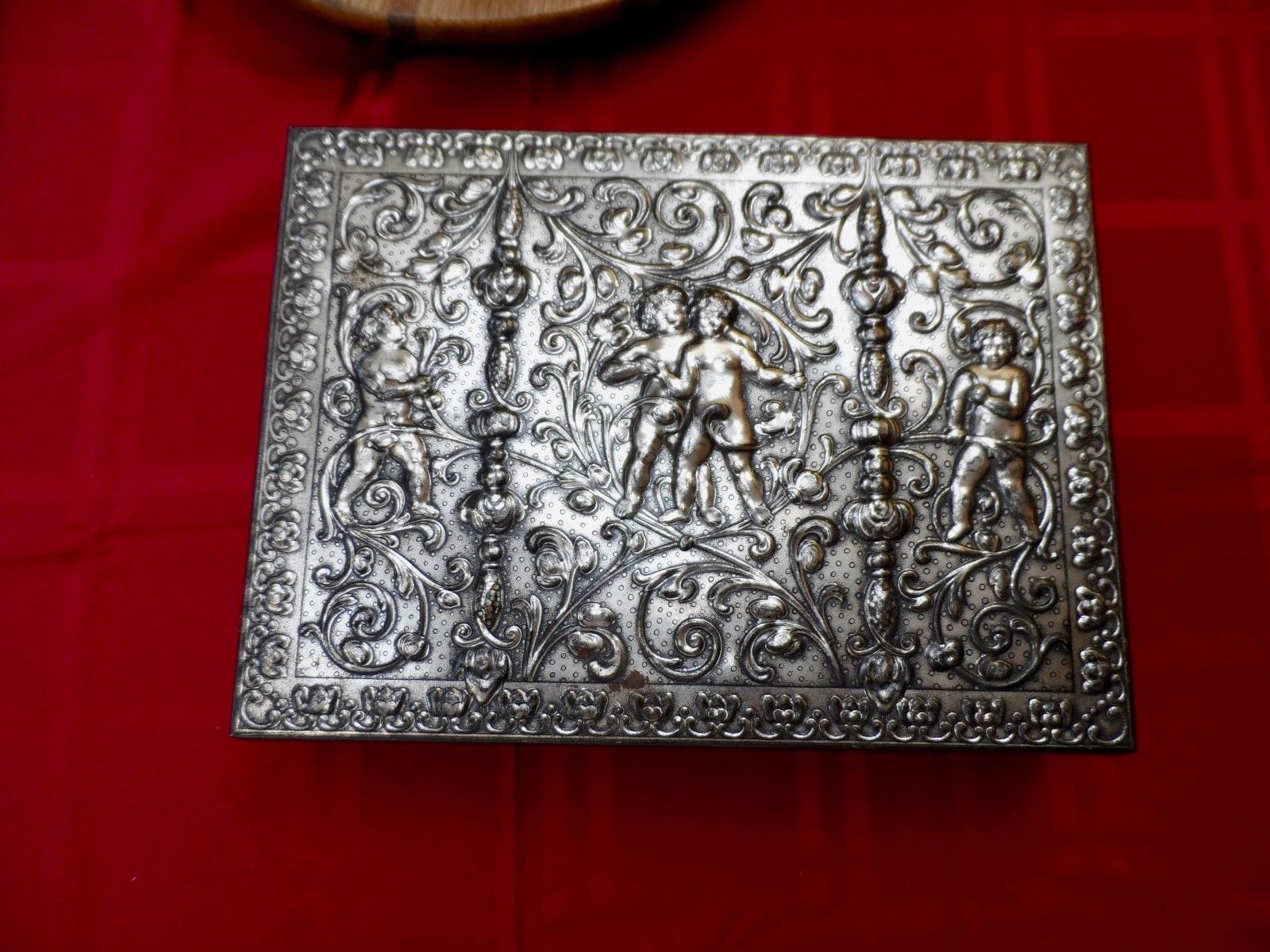 Title (ebay affiliate link): Vintage Silvertone Tin Box w/ Cherubs Made in Western Germany 12"x9"x2 3/4"