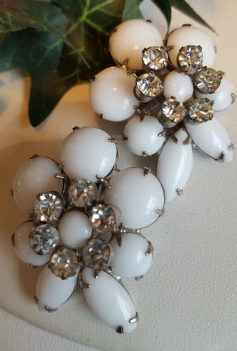 Title (ebay affiliate link): Vintage Juliana layered white milk glass and rhinestone clip back earrings, huge