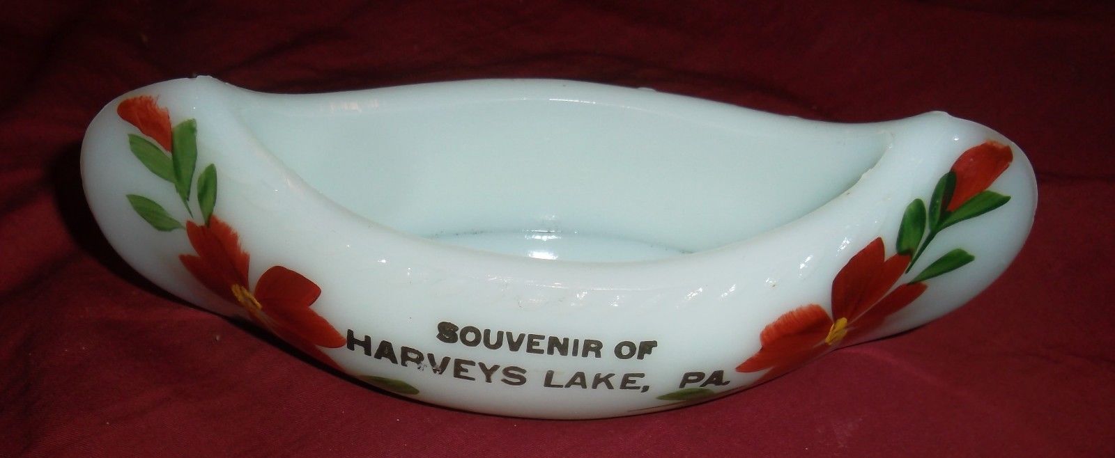 SOUVENIR OF HARVEY''S LAKE PA. MILK GLASS BOAT
