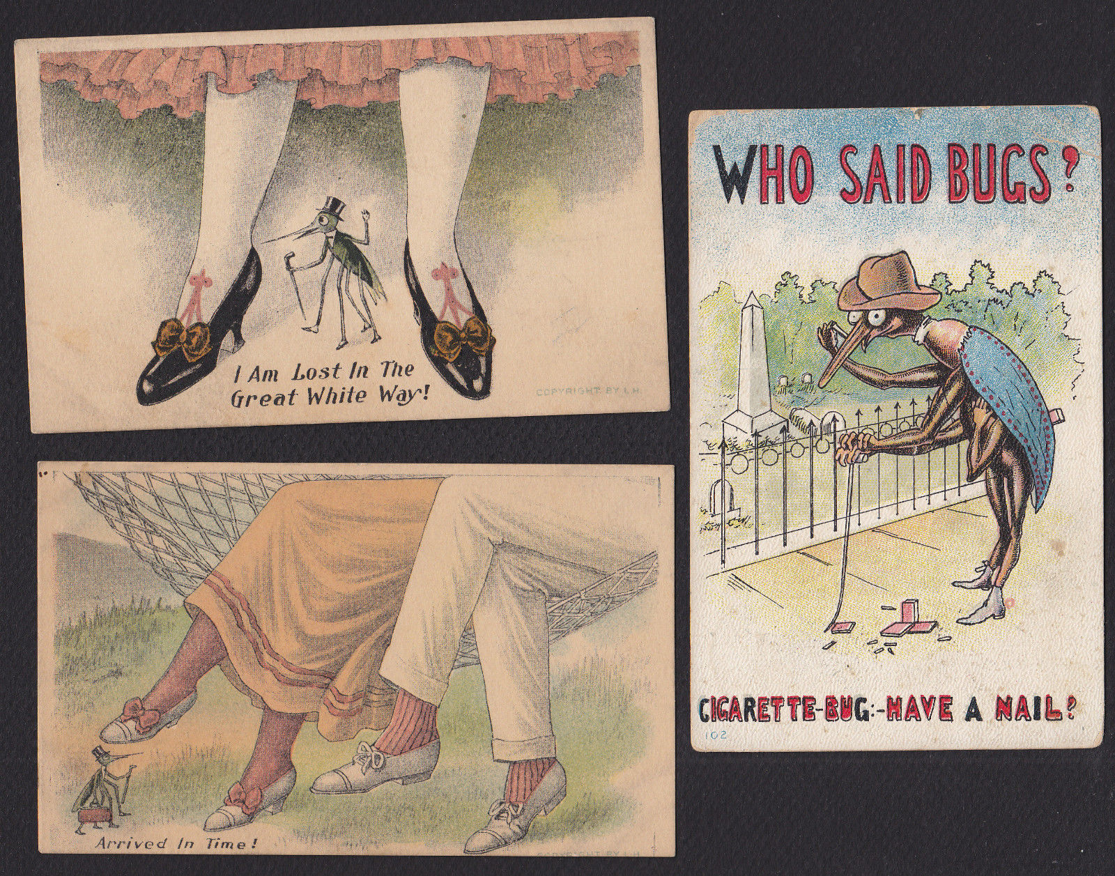 Title (ebay affiliate link): 3-Comic-Humor-Mosquito-Cigarette Bug-Legs-Shoes-Antique Postcard Lot