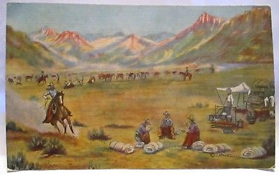 1940 ART SIGN DUDE LARSEN POSTCARD # 14 " THE ROUNDUP " COWBOY,HORSES CAMP UNUSE