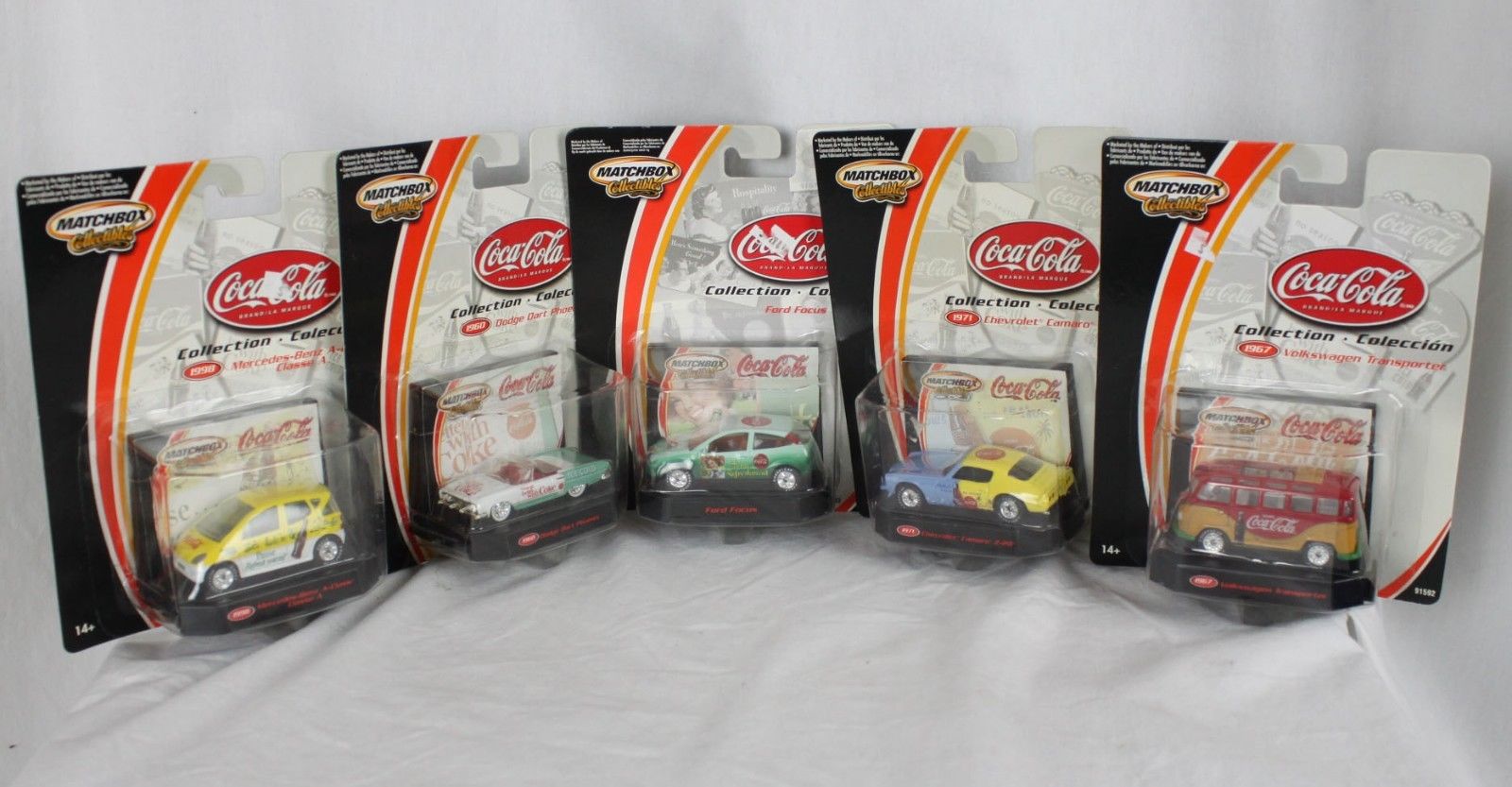 5 Matchbox Coca Cola Coke Cars Camaro Benz Focus Volkswagen Bus Dart New in Pack