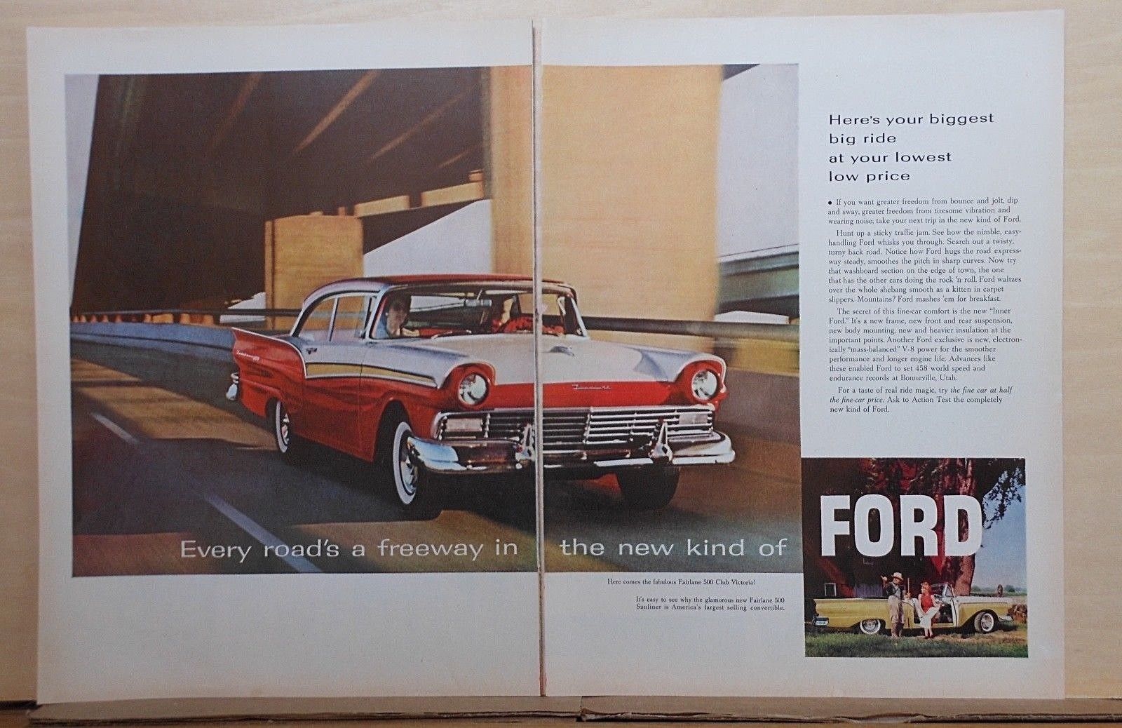 1957 two page magazine ad for Ford - Fairlane 500 Club Victoria on freeway