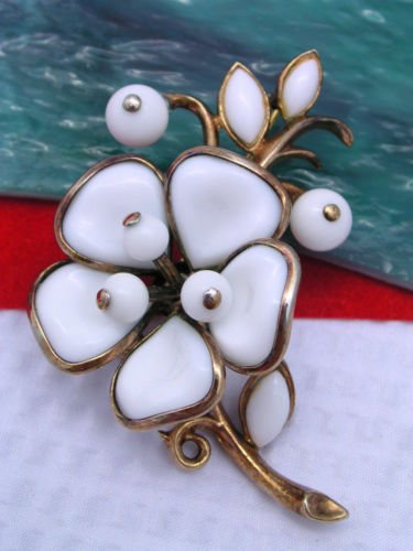 Title (ebay affiliate link): Vintage signed Trifari Poured White Milk glass Flower Brooch Pin
