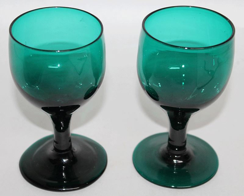 TWO! Antique FLINT GLASS Emerald Green WINE GLASSES