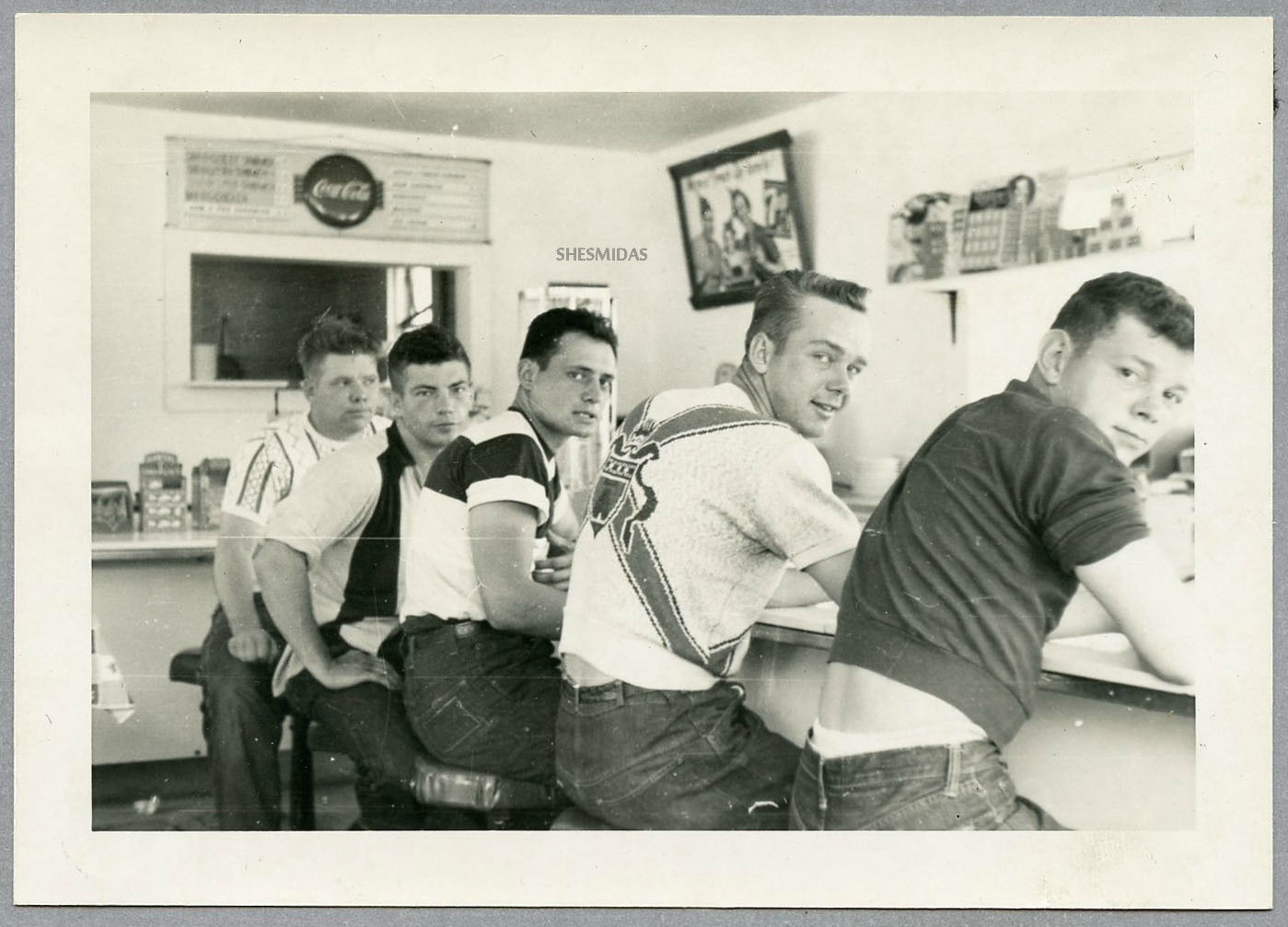 Title (ebay affiliate link): #43 Men at the Drugstore, Coca Cola & 7UP Signs, Vintage 1951 Gay Int Photo