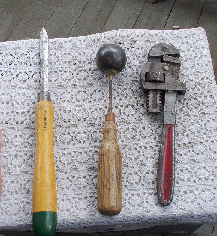 Title (ebay affiliate link): LOT Vintage Tools Millers Falls Pounder Chisel Monkey Pipe Wrench Peck & Mack NR