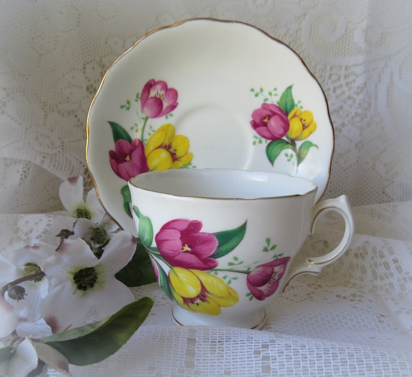 Title (ebay affiliate link): Lovely Royal Vale Tea Cup and Saucer-Pink Yellow Tulips-Bone China-England