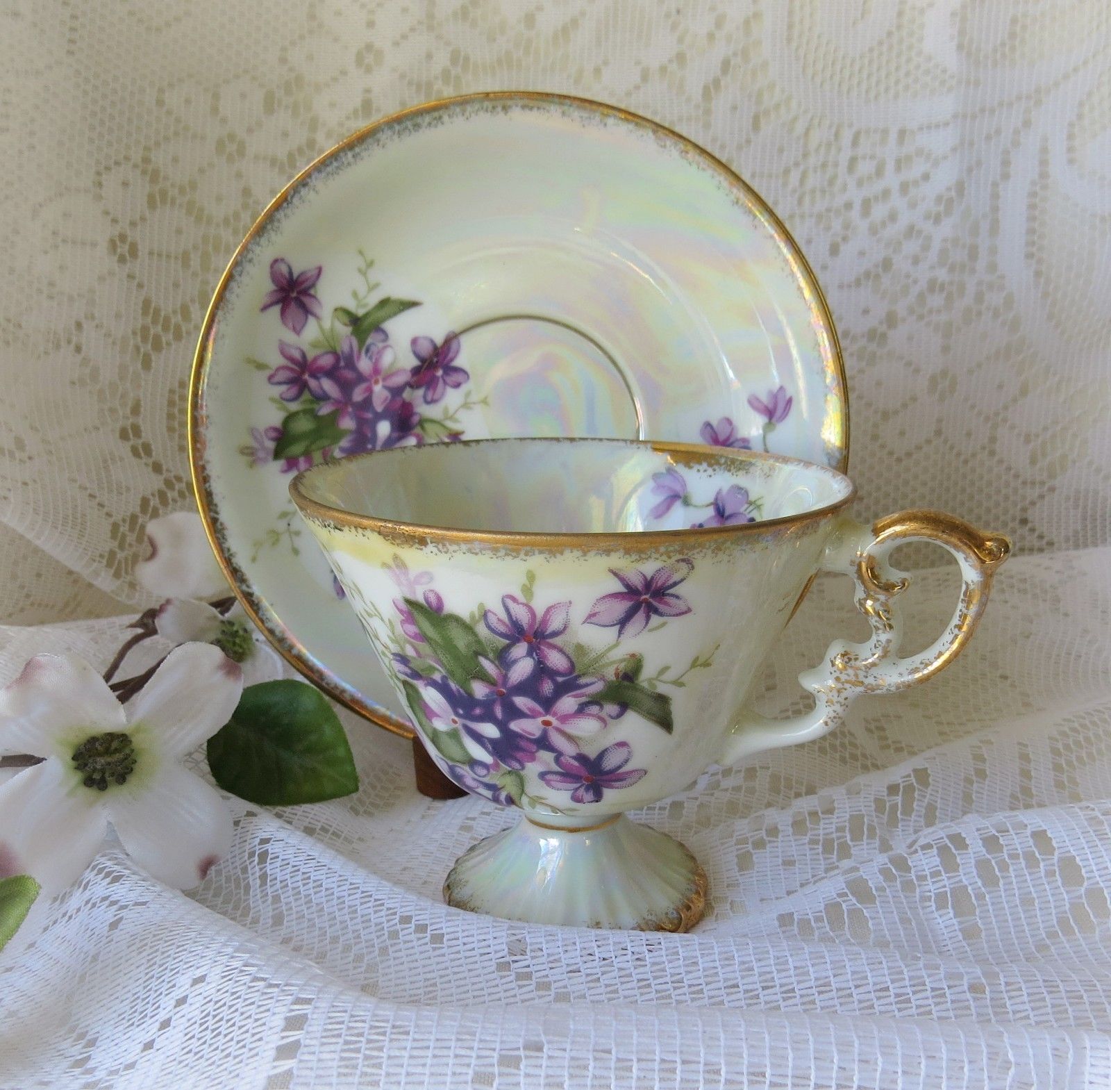 Title (ebay affiliate link): Beautiful Enesco February Violet Iridescent Purple and Gold Tea Cup and Saucer