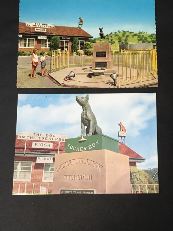 Vintage Photo Postcard DOG ON TUCKERBOX, 5 MILES FROM GUNDAGAI NSW x 2