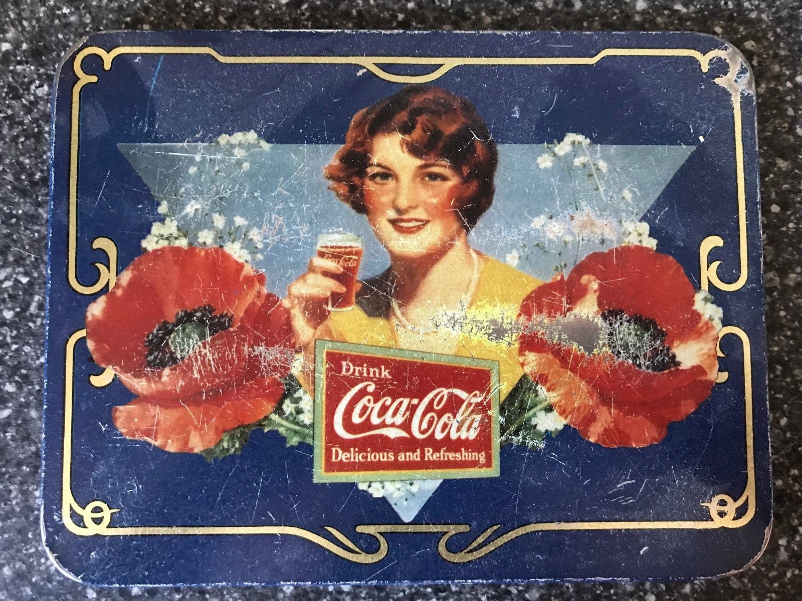 Title (ebay affiliate link): Vintage Metal Tin Hotplate Coke, Coca-Cola Sign Woman Holding a Coke
