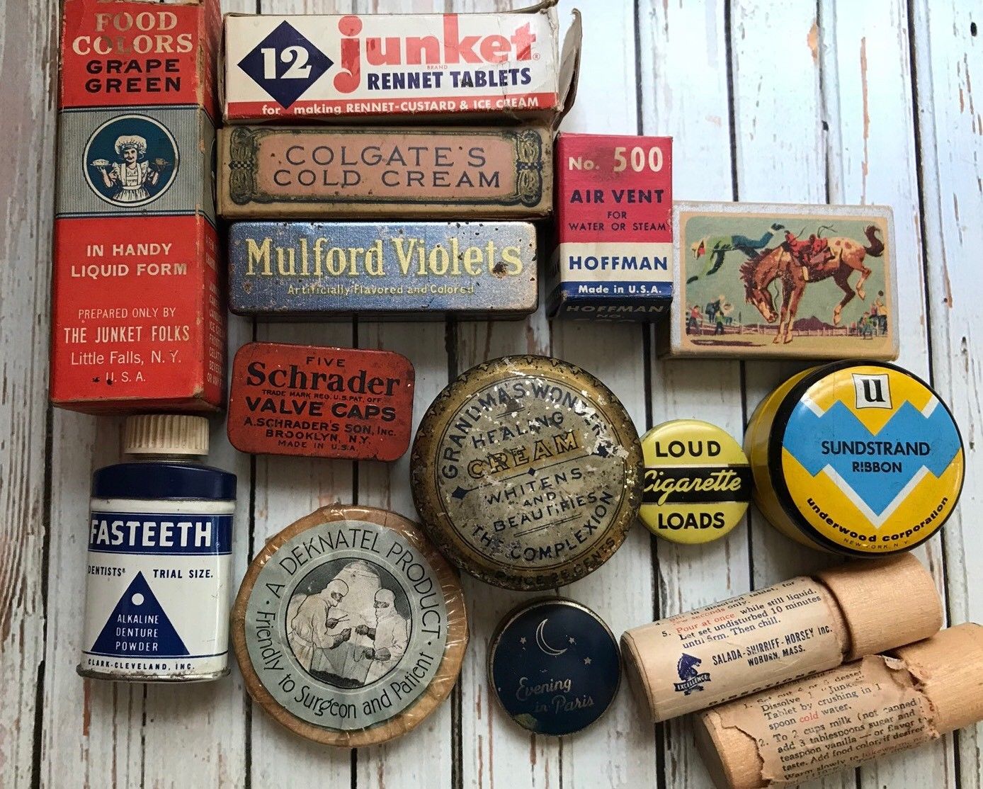 Title (ebay affiliate link): Vintage Mixed Lot Advertising Tins Boxes Bottles 17 piece Lot Antique