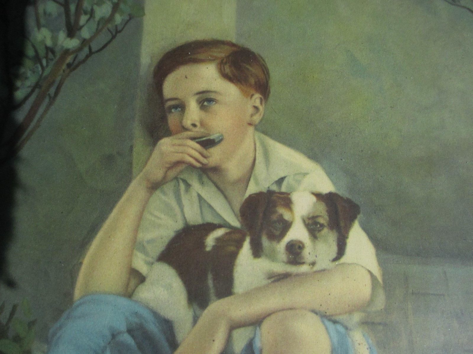 Title (ebay affiliate link): Lovely Print Antique Art Calendar Sample Boy W/Dog Playing Harmonica In Garden