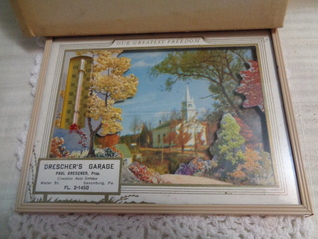 1958 VINTAGE ADVERTISING THERMOMETER / CALENDAR - DRESCHER''S GARAGE PA.