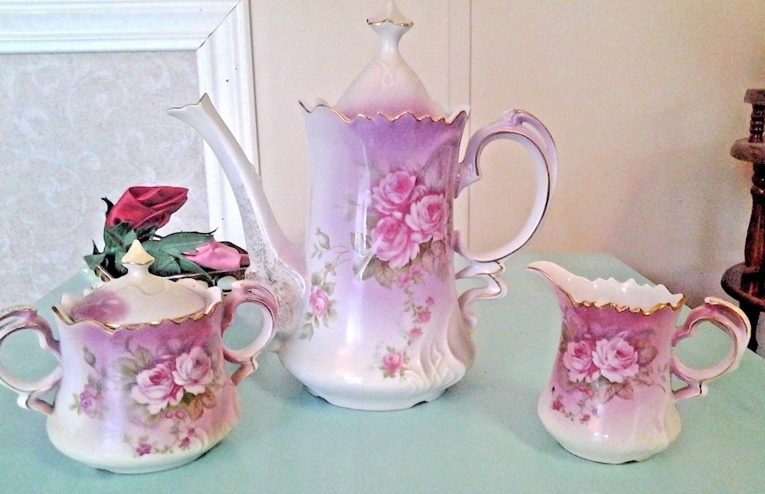 LEFTON CHINA HEAVENLY ROSE TEA CHOCOLATE COFFEE SET LIDDED 3 PC SET BEAUTIFUL!!!