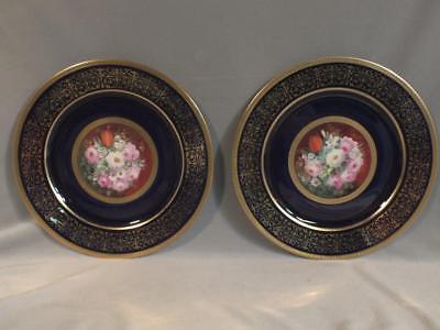 PAIR FINE GUERIN LIMOGES COBALT & GILT CABINET / DINNER PLATES PAINTED FLOWERS