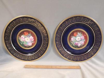 PAIR GUERIN LIMOGES COBALT & GILT CABINET / DINNER PLATES PAINTED FLOWERS (#2)