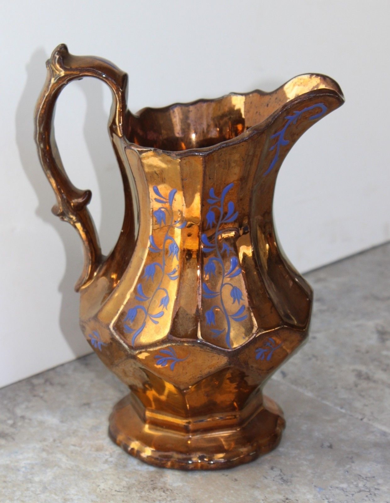 Antique Copper Luster Pitcher With Added Blue Floral Sprigs