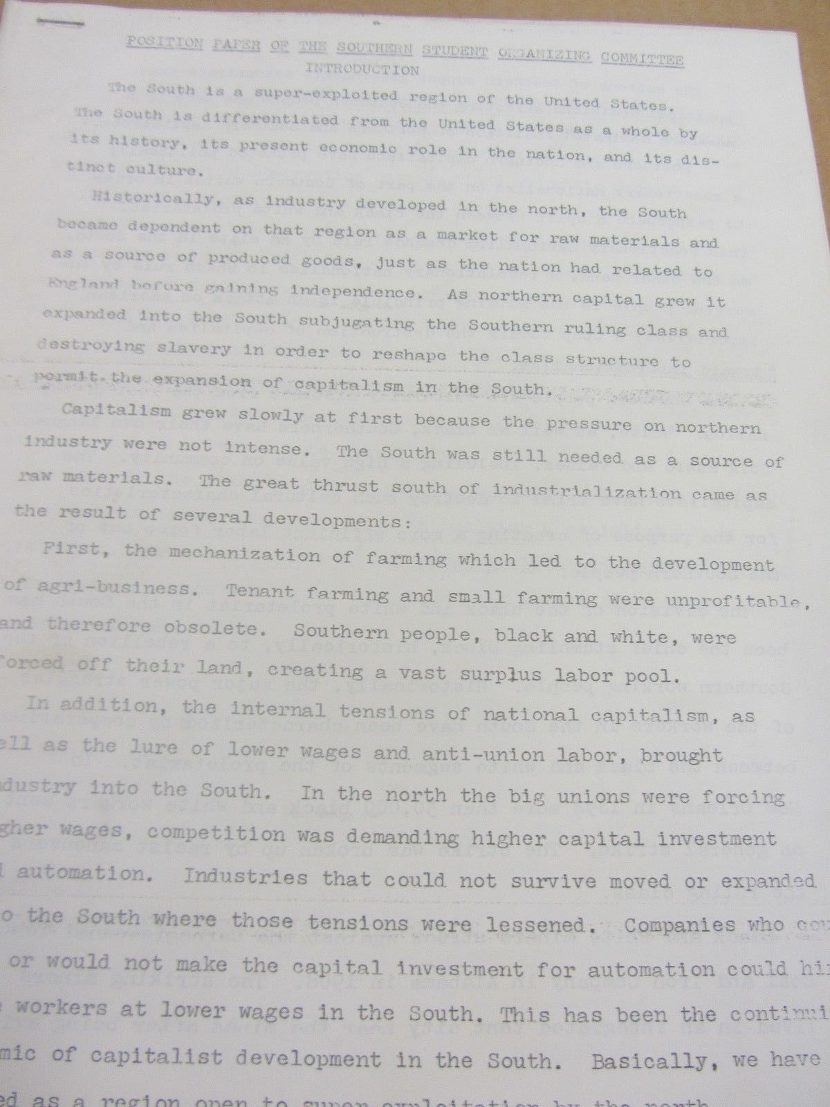 Position Paper of the Southern Student Organizing Committee SDS SSOC 1960s