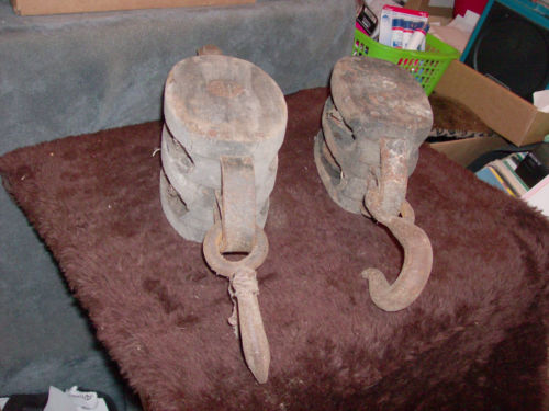 Title (ebay affiliate link): 2 VINTAGE WOOD BLOCK & TACKLE DOUBLE PULLEYS OLD