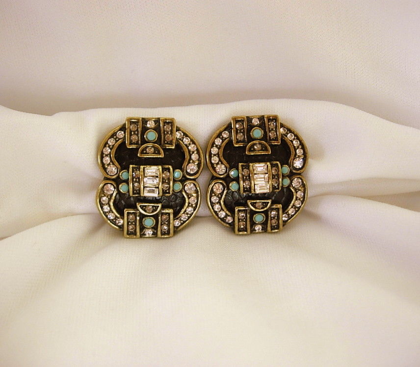 Heidi Daus Faux Turquoise Milk Glass Antiqued GT Metal Crystal Clip On Earrings