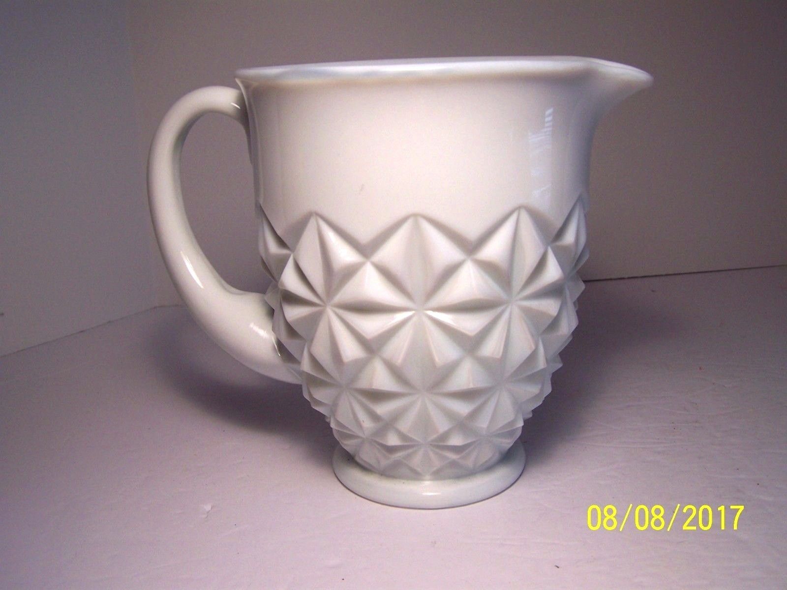 Title (ebay affiliate link): Vintage Tiffin Glass Co. milk glass pitcher "Williamsburg" pattern #300.