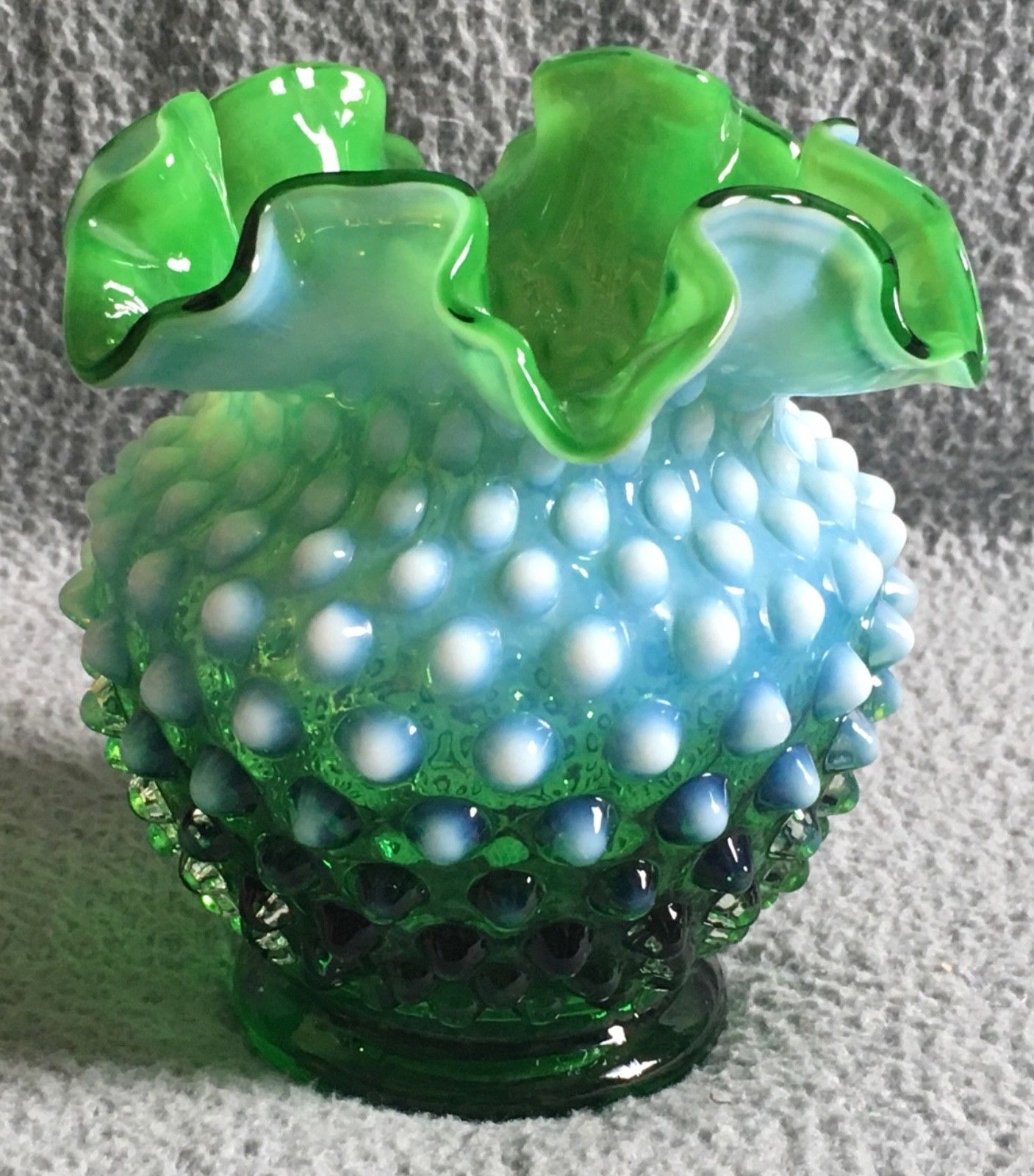 Fenton Green White Hobnail Ruffled Vase Milk Glass