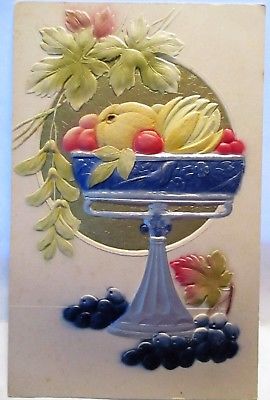 Title (ebay affiliate link): 1910 HIGHLY EMBOSSED POSTCARD SILVER & BLUE COMPOTE WITH BIRD, FILLED WITH FRUIT