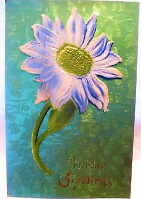 Title (ebay affiliate link): 1910 POSTCARD BIRTHDAY GREETINGS, BLUE SILK APPLIED FLOWER