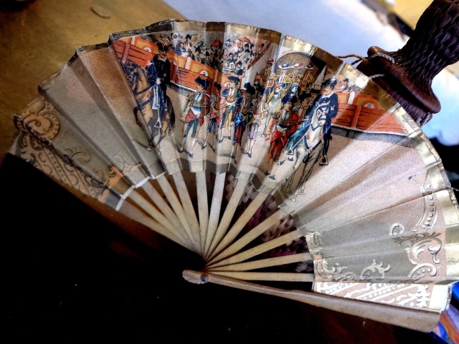 Title (ebay affiliate link): OLD VINTAGE ANTIQUE SMALL 4.75" HAND HELD FAN BULL FIGHT ART WORK w. ADVERTISING