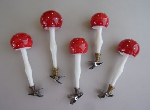 Title (ebay affiliate link): 5 VINTAGE CLIP ON BLOWN GLASS MUSHROOMS CHRISTMAS ORNAMENTS