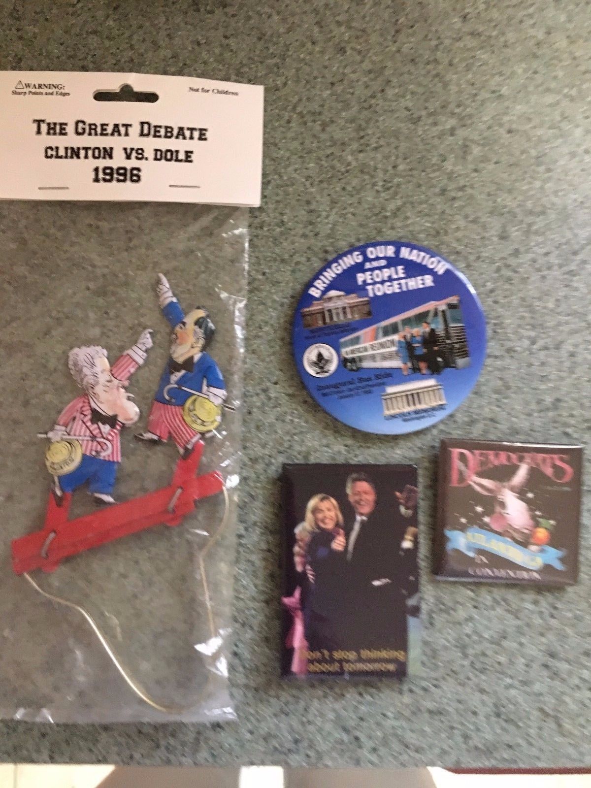 Title (ebay affiliate link): 1996 The Great Debate - Clinton vs. Dole Tin Toy NIP plus three democratic pins