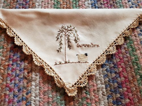 Title (ebay affiliate link): ~*Awesome~* Primitive "Summertime w/ Sheep" Hand Stitched Doily! Oh My!