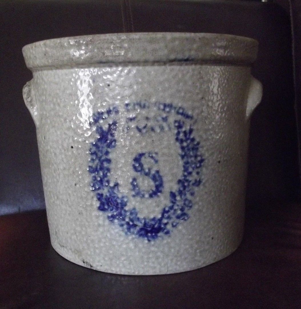 Antique Stoneware Crock Cobalt Wreath & "S" 1 Gallon with Handles