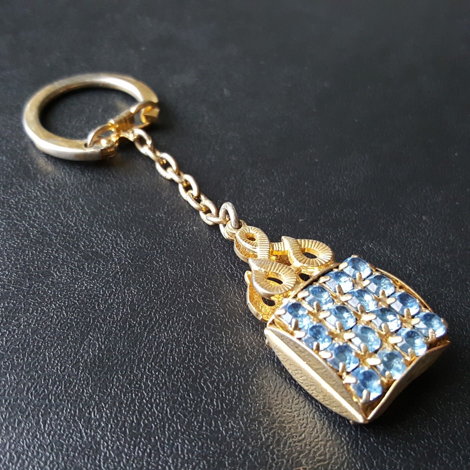 Title (ebay affiliate link): Vintage Deco Key Chain Gold Tone Sapphire Blue Rhinestone O30