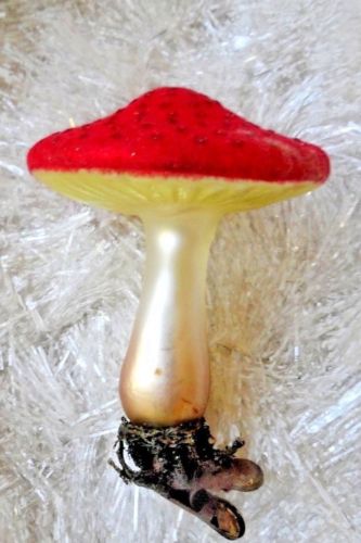 Title (ebay affiliate link): Vintage Antique Glass Christmas - CLIP ON MUSHROOM w/FLOCK & GLITTER