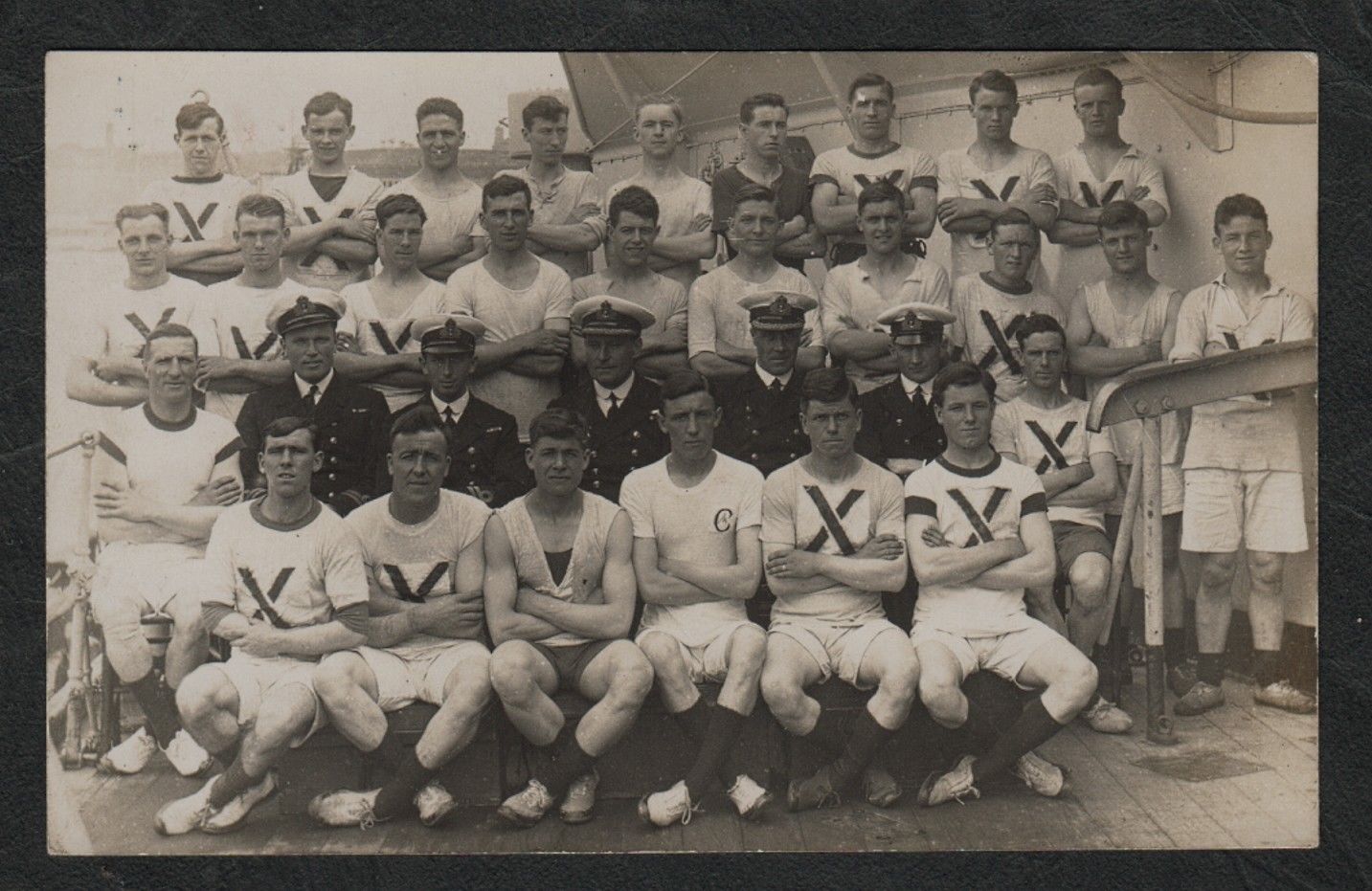 e1818) NAVY SHIP POSTCARD - GROUP PHOTO -SPORTING TEAM ! OFFICERS