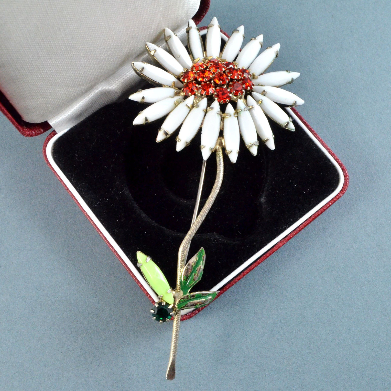 Title (ebay affiliate link): Vintage Flower Brooch Large 1960s Milk Glass Crystal Goldtone Bridal Jewellery