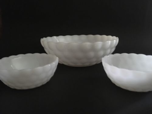 Title (ebay affiliate link): VINTAGE ANCHOR HOCKING MILK GLASS BUBBLE SERVING DISH & 2 DESSERT BOWLS