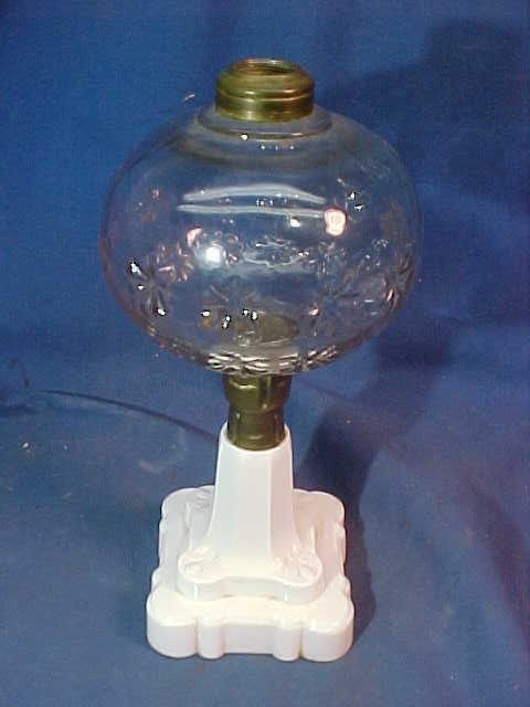 Title (ebay affiliate link): 19thc OIL LAMP w STAR Pattern GLASS FONT + White MILK GLASS BASE