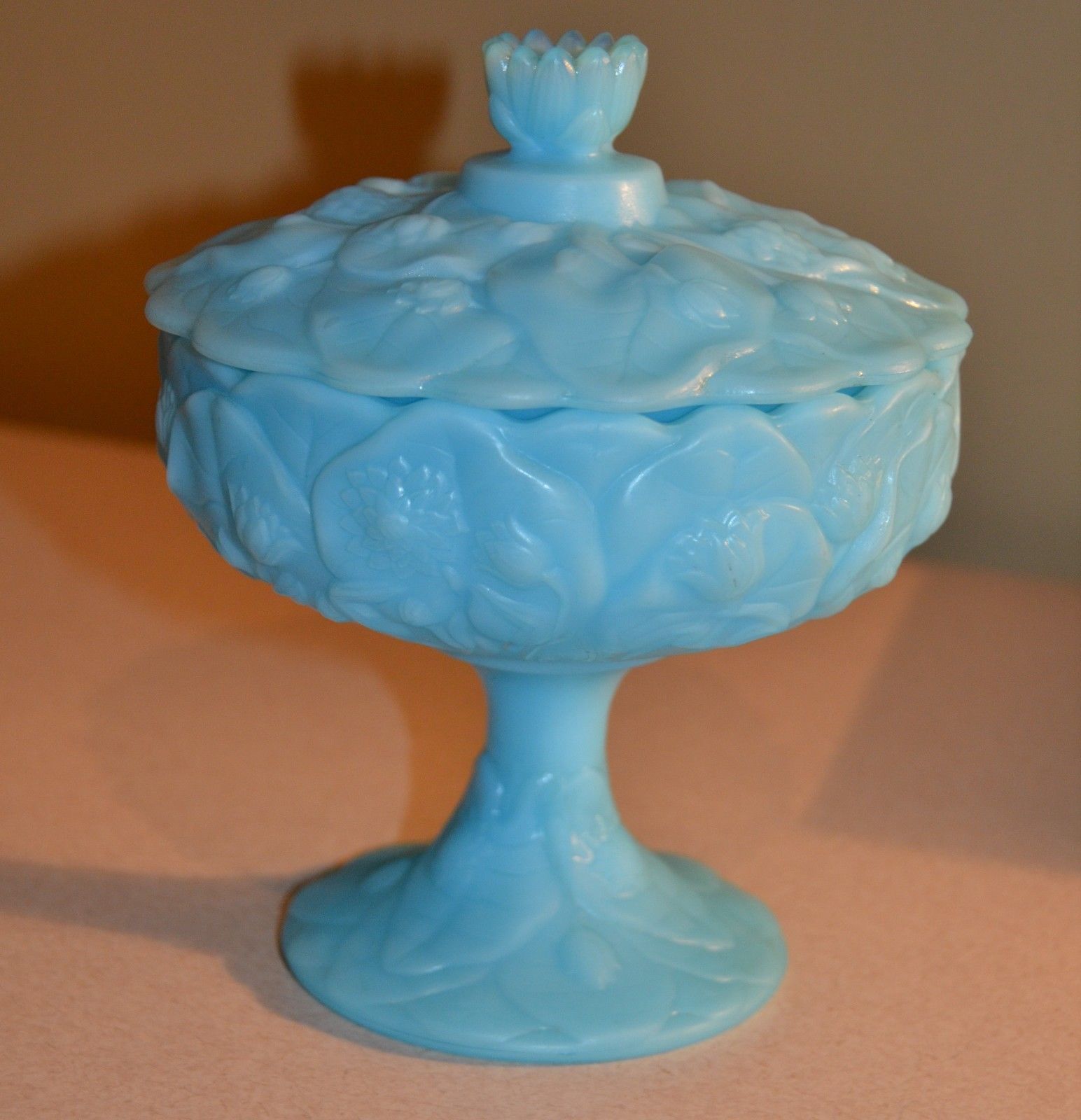 Fenton Blue Milk Glass Satin Water Lily Lidded Compote