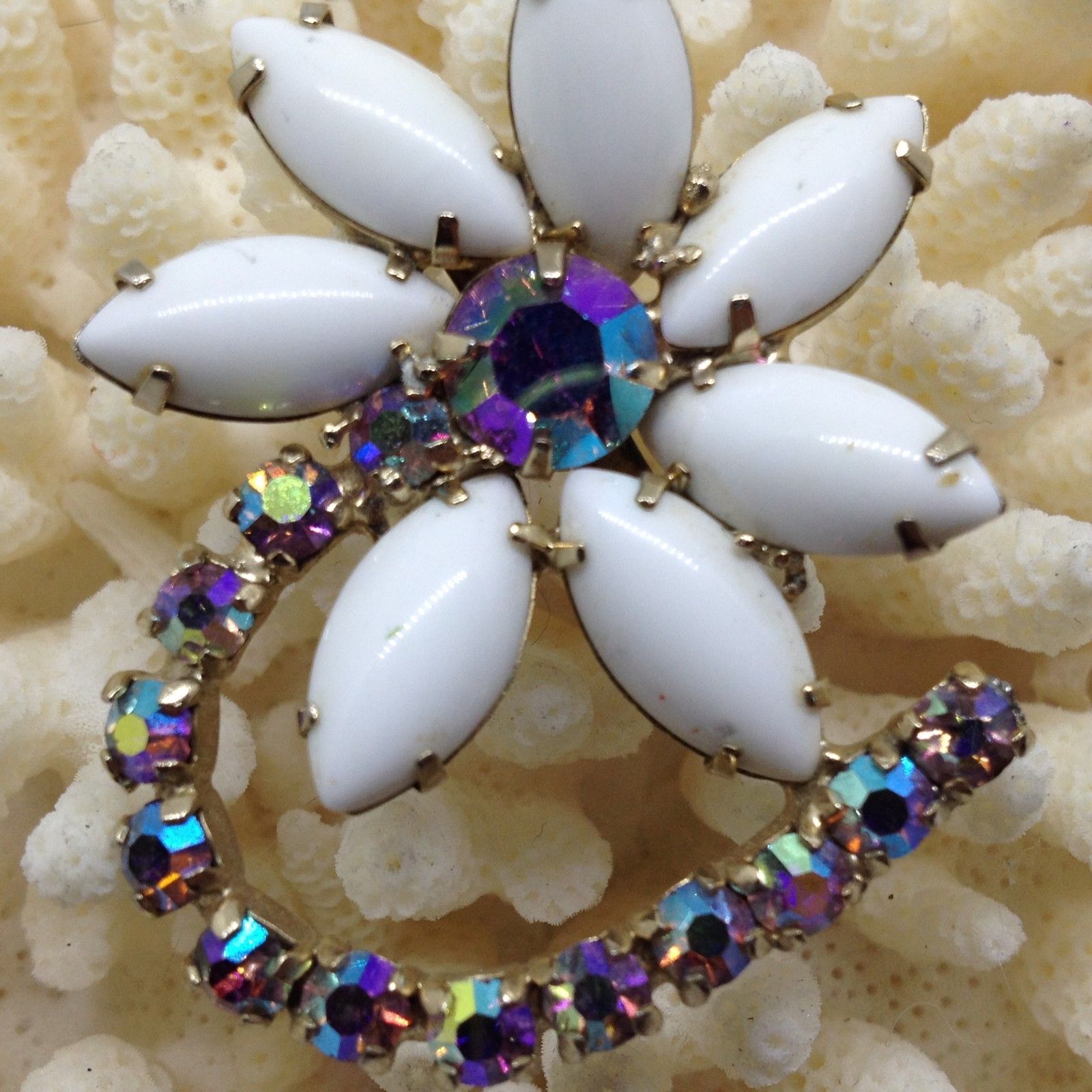 Title (ebay affiliate link): Vintage FLOWER BROOCH PIN White Milk Glass Aurora Borealis Rhinestone AB Jewelry
