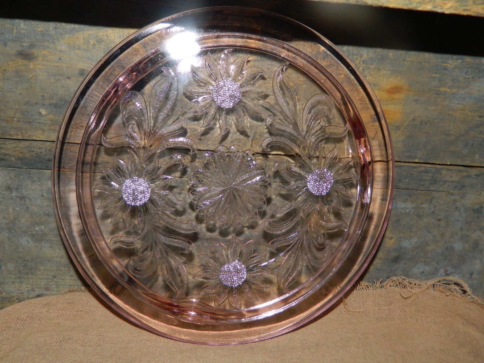 Title (ebay affiliate link): Vintage Pink Depression Glass 3 Footed Cake Plate Sunflower Pattern Excellent..