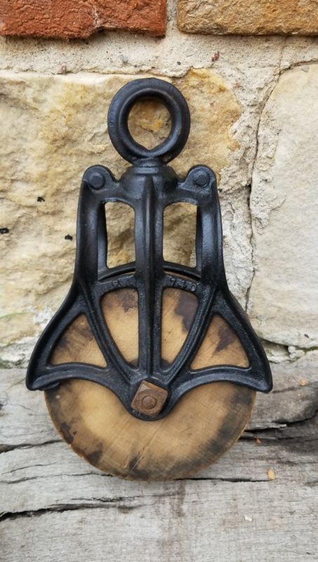 Title (ebay affiliate link): Antique Primitive Cast Iron & Wood Primitive Barn Pulley