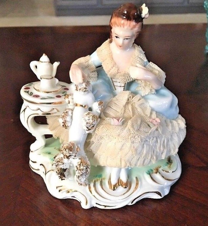 Title (ebay affiliate link): Vintage European Lace Porcelain Lady Figurine Sitting in Chair at Table w/Poodle