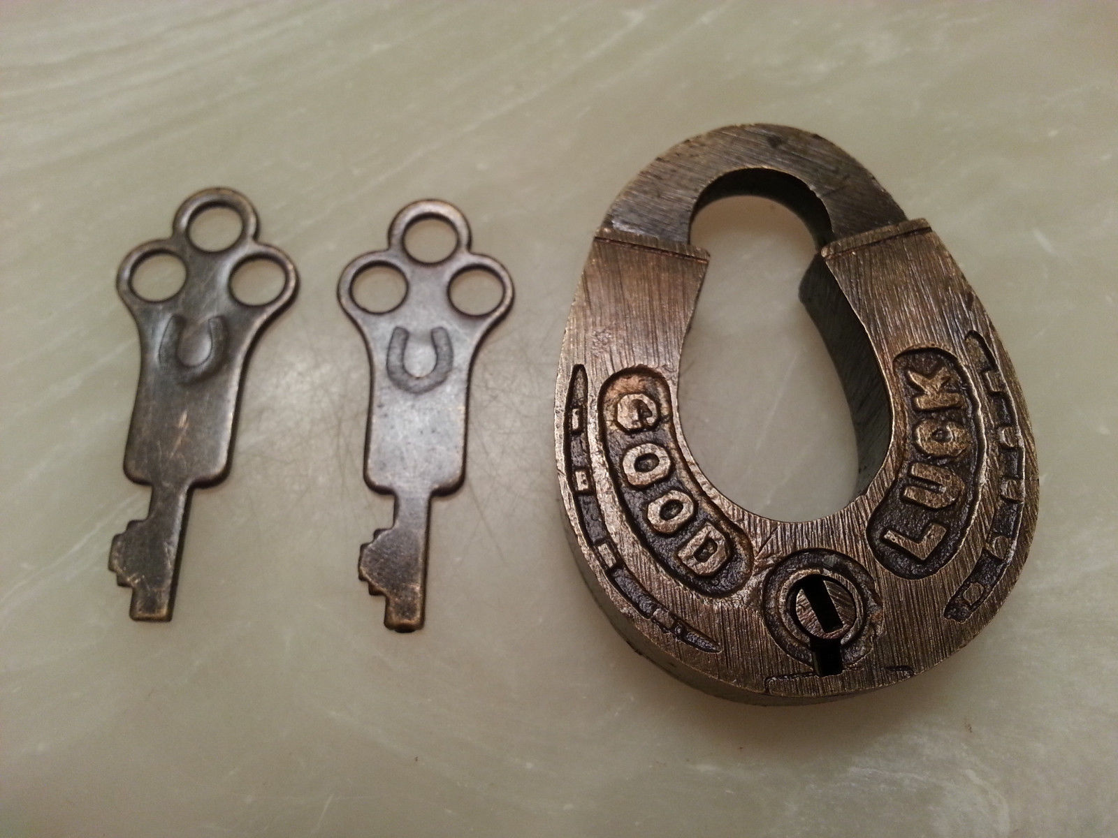 Title (ebay affiliate link): Horse Shoe Lock Good Luck Solid Brass Lock Two Keys Lucky Charm Wedding Padlock