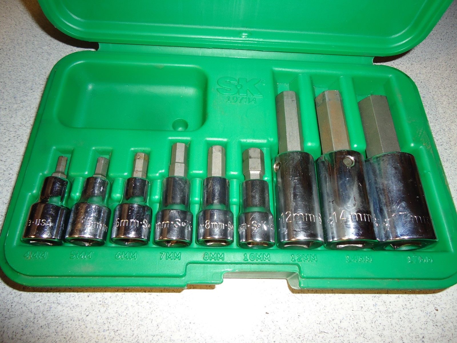 Title (ebay affiliate link): SK S-K 3/8" 1/2 dr. Metric Hex Key Socket Tool Set 4-17mm w/ Green Case 19734